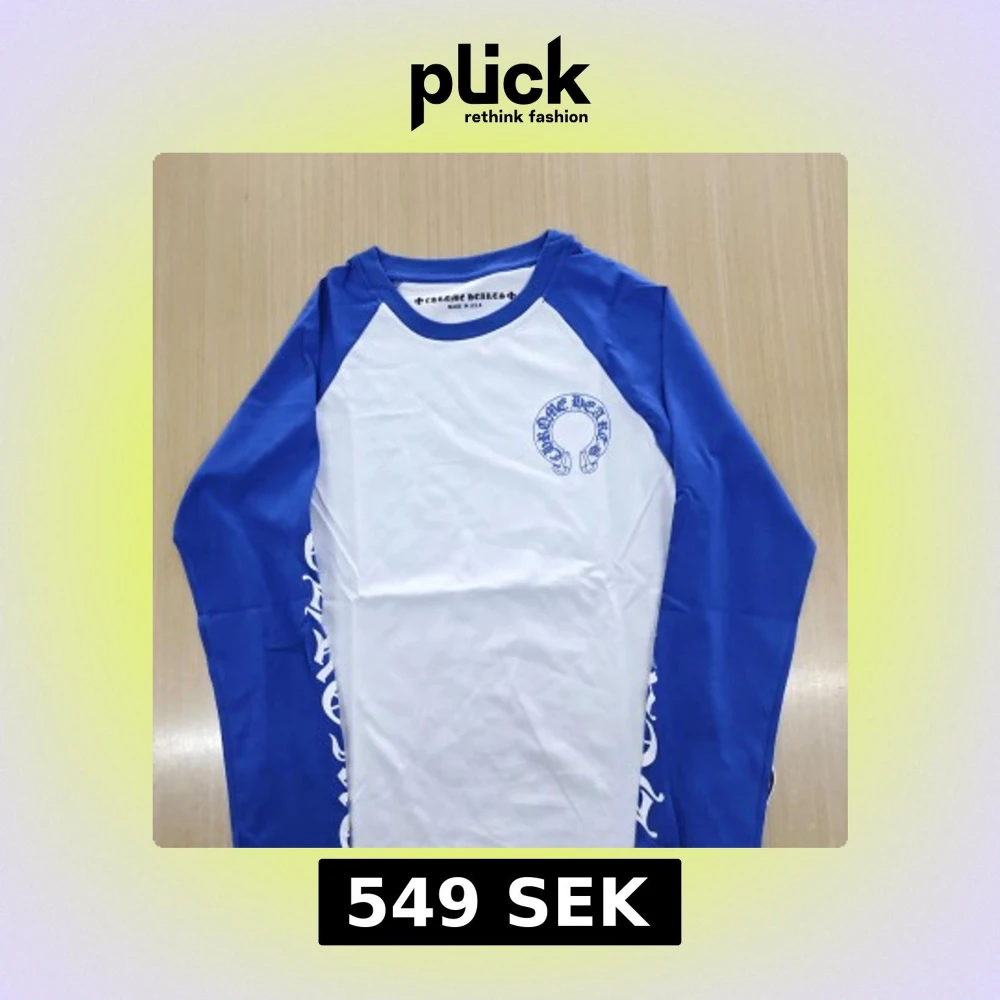 Säljer en blåvit långärmad tröja från Chrome Hearts med stora tryck på ryggen och ärmarna. Tröjan har raglanärmar i blått och kroppen i vitt, med coola loggor och text i blått. Tillverkad i mjuk bomull, perfekt för dig som gillar streetwear vibes. Den är s men passar M också