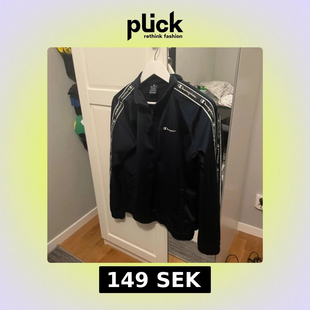 Snygg svart vindjacka från Champion i storlek medium. Jackan har dragkedja framtill och vita logoband längs ärmarna. Lätt och sportig design med lång ärm, perfekt för chill och streetwear. Materialet är polyester och jackan har klassisk passform.