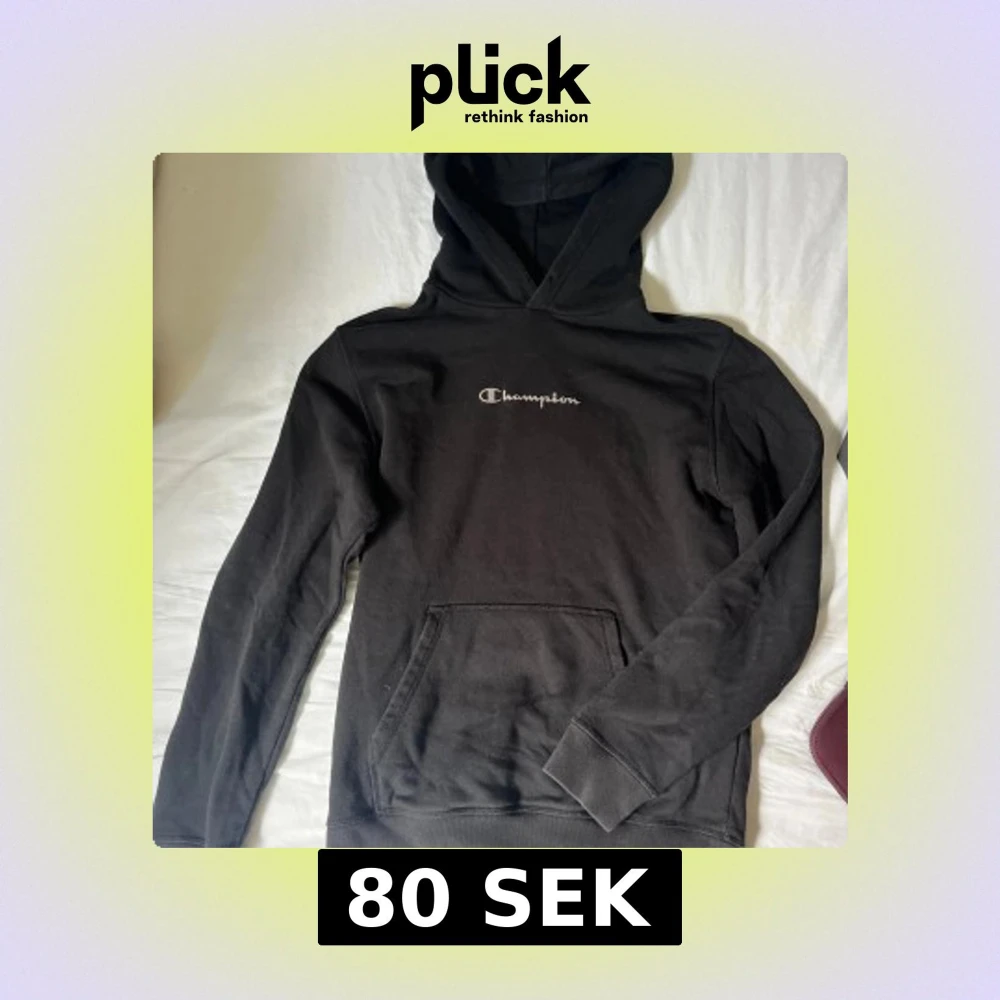 Svart hoodie från Champion i storlek M. Klassisk modell med huva, magficka och Champion-logga broderad på bröstet. Mjuk och skön bomullsblandning. Snöret är borta