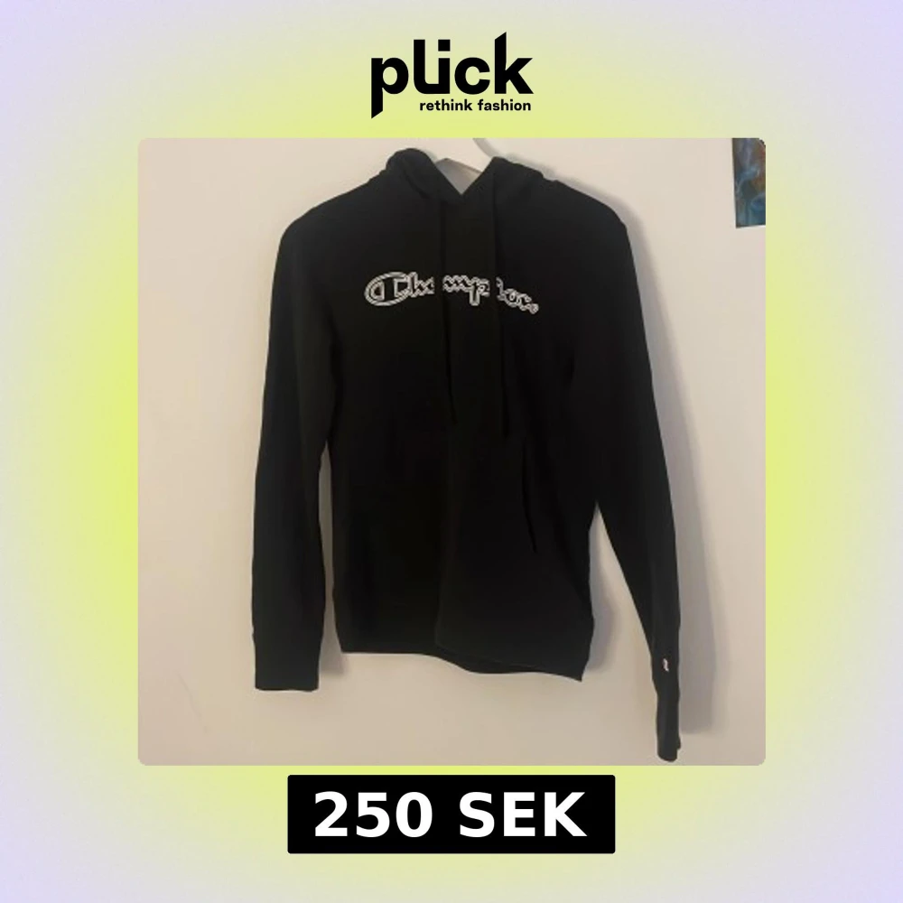 Svart hoodie från Champion med stor vit logga på bröstet och klassisk huva med snörning. Mjuk bomullskänsla och långärmad modell. Liten Champion-logga även på ärmen. Perfekt för chill eller streetwear.