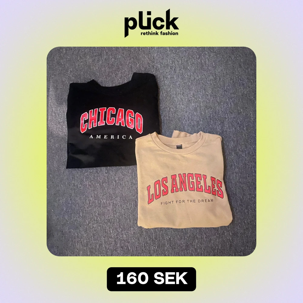 Säljer två snygga sweatshirts med tryck. Den ena är svart med 'CHICAGO AMERICA' i rött och vitt, och den andra är beige med 'LOS ANGELES FIGHT FOR THE DREAM' i rött och svart. Perfekta för en avslappnad stil och passar bra till jeans eller joggers. Båda är i bra skick och redo för nya äventyr!