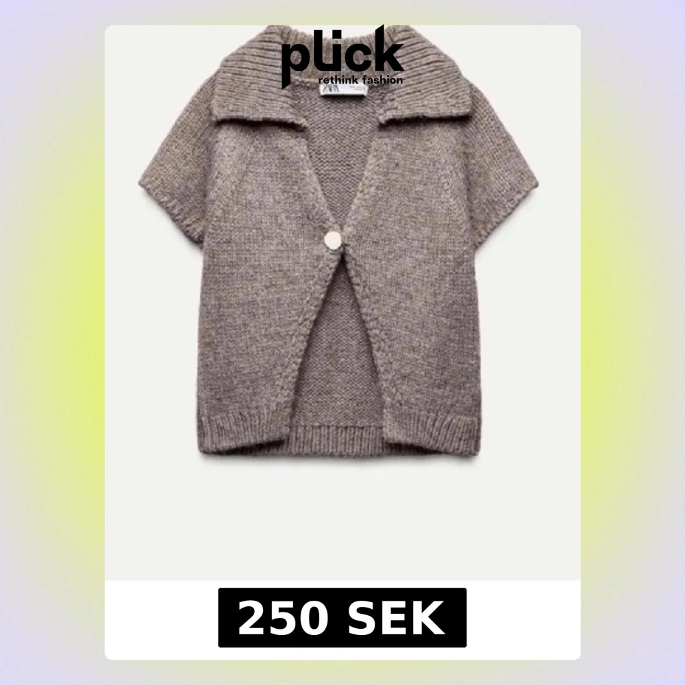 Kortärmad stickad kofta från Zara i beige nyans. Koftan har en bred krage, en dekorativ knapp framtill och ribbstickade kanter. Perfekt att slänga över en topp för en chill look.