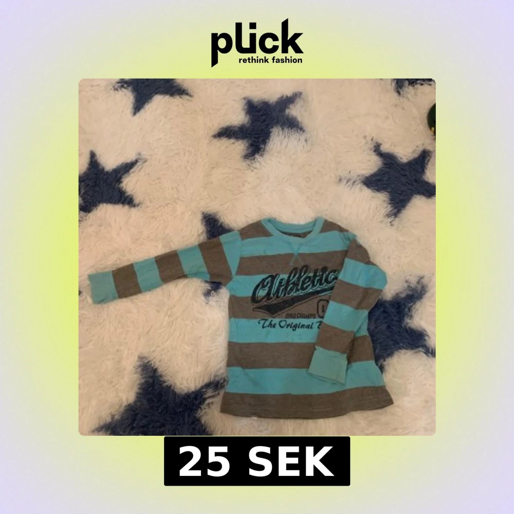 Säljer en randig långärmad tröja från Cubus i turkos och grått. Tröjan har texten 'Athletic 1962 Champs' tryckt på framsidan. Perfekt för en sportig look!