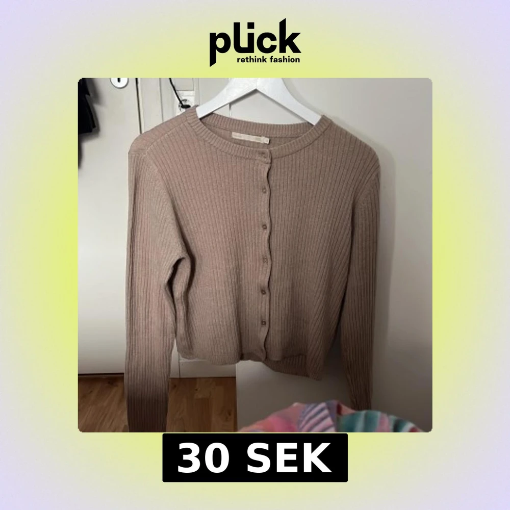 Säljer en beige ribbad kofta från 157 i storlek M. Koftan har långa ärmar, rund halsringning och knappar framtill. Perfekt att slänga över en topp för en enkel och stilren look.