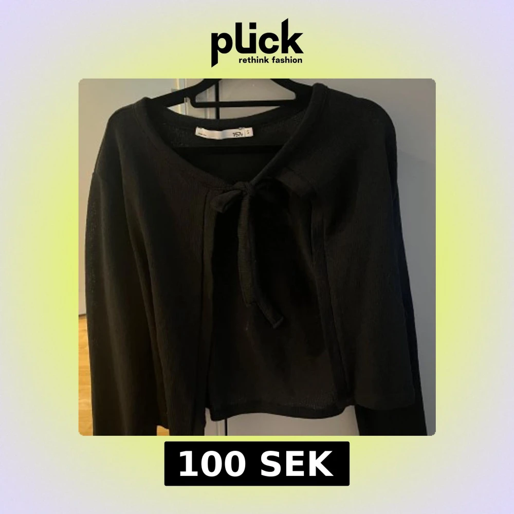Svart kofta från 157 i storlek S. Modellen är croppad med långa ärmar och har en knytning framtill vid halsen. Perfekt att slänga över en topp för en enkel och stilren look. Sänker i pris då den är oanvänd utan prislapp