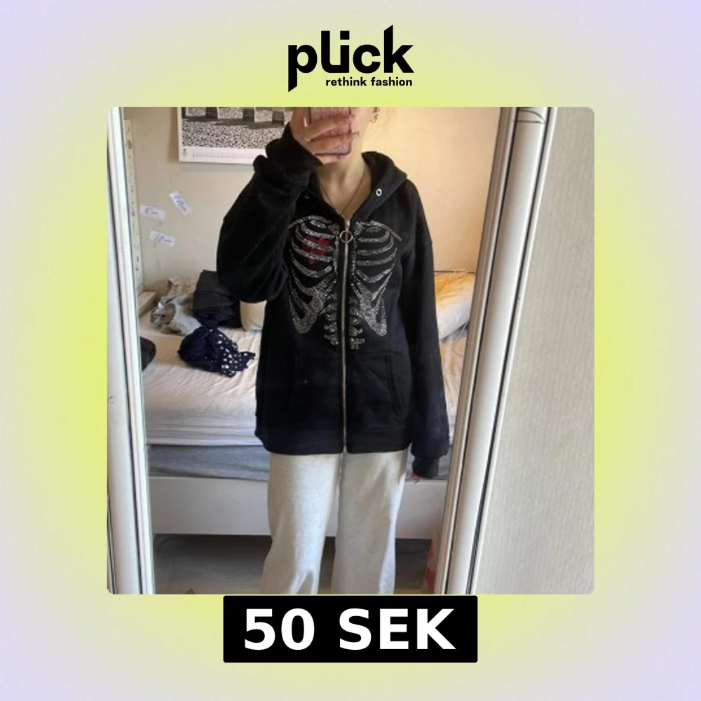 50kr Säljer en svart hoodie från Romwe med dragkedja och huva. Framsidan har ett detaljerat skelettmönster i strass och ett rött hjärta. Hoodien är i mjuk bomullsblandning och har fickor framtill. Perfekt för dig som gillar unika detaljer!