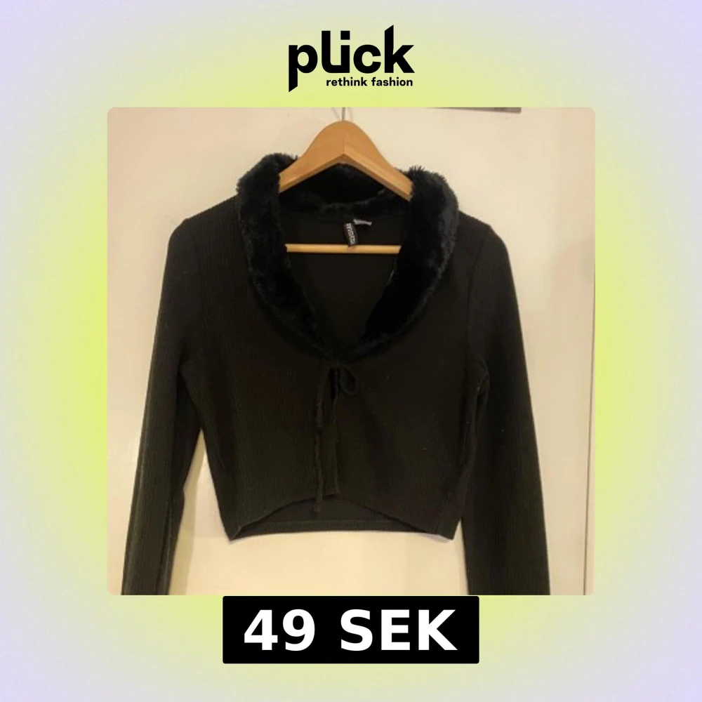Säljer en svart croppad kofta med mjuk fuskpäls runt kragen och knyt framtill. Tröjan är ribbad och har långa ärmar. Perfekt för att lyfta en outfit med lite extra stil.