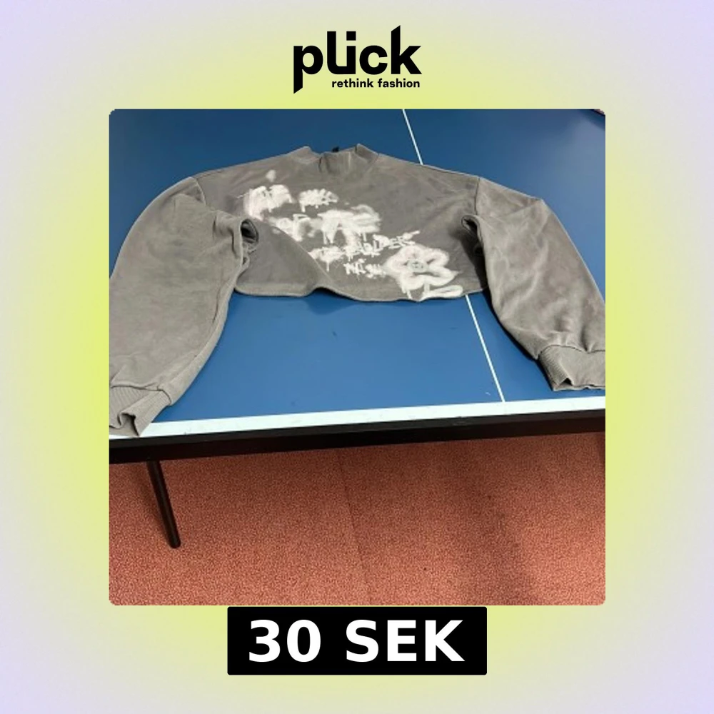 Säljer en grå croppad tröja från Divided med tryck på framsidan. Tröjan har långa ärmar och ribbade muddar vid ärmslut.