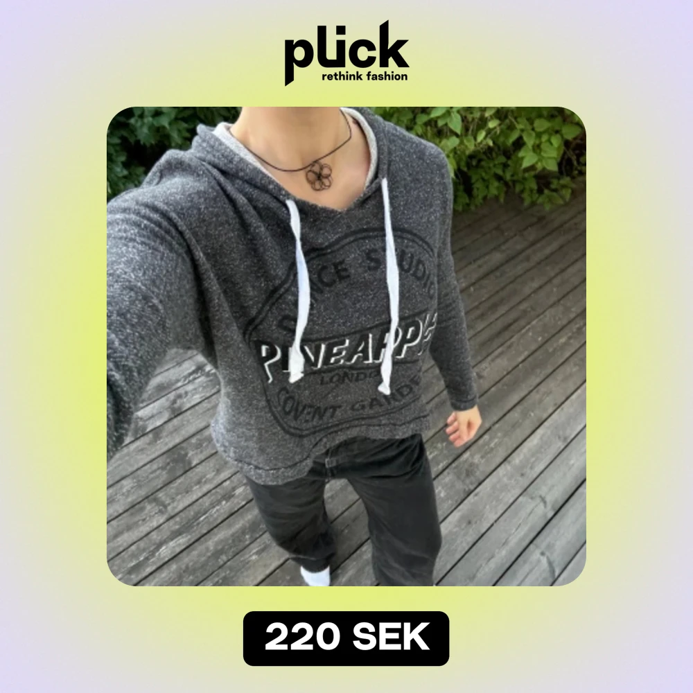 Mörkgråmelerad, hoodieliknande tröja med långa ärmar, justerbar liten luva samt tryck i storlek S. Köpt i London på dansskolan ”Pineapple”. Nyskick. Material: 100% bomull. :)