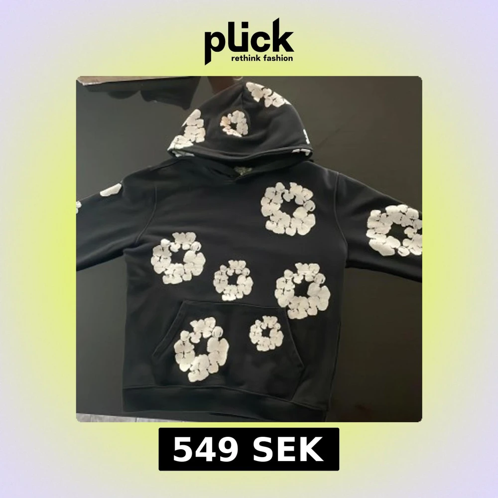 Svart hoodie från Denim Tears med stora vita blommor tryckta över hela tröjan, både fram och bak samt på huvan. Klassisk känguruficka framtill och mjukt material. Perfekt statement-plagg för dig som vill sticka ut.