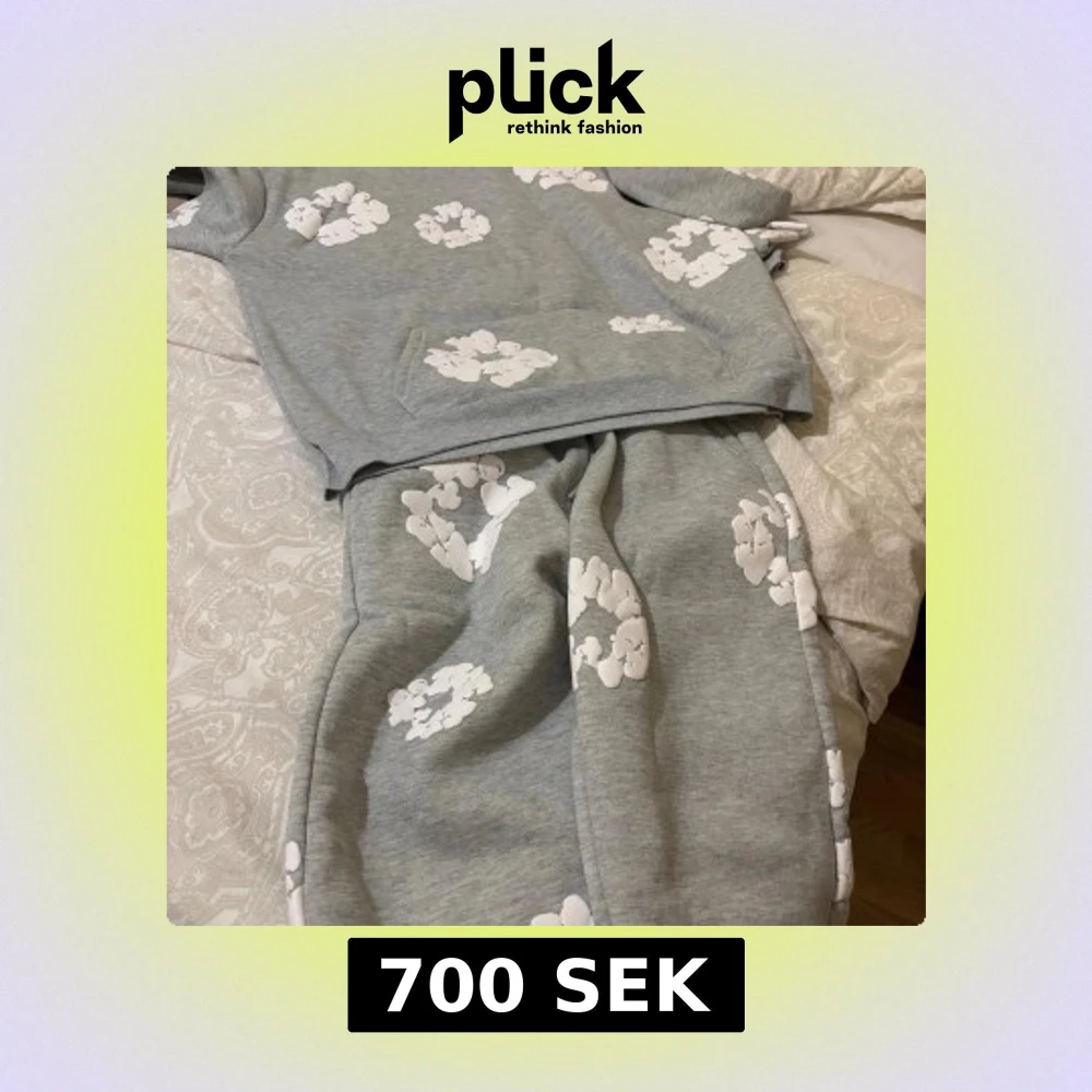 Säljer en grå hoodie från Denim Tears med vita blommiga tryck över hela tröjan. Hoodien har en klassisk huva och magficka, och är fodrad med mjuk fleece på insidan. Perfekt för dig som gillar streetwear och vill sticka ut med snygga detaljer.