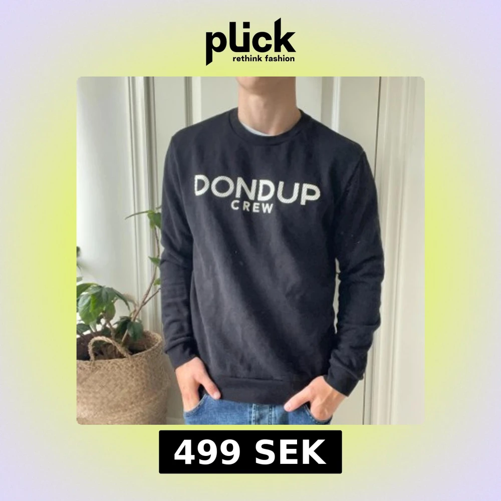 Svart sweatshirt från Dondup - Säljer en svart sweatshirt från Dondup med vit text 'DONDUP CREW' på bröstet. Tröjan har rund hals och långa ärmar, perfekt för en avslappnad stil. Passar dig som gillar klassiska och stilrena plagg. Storlek liknar M