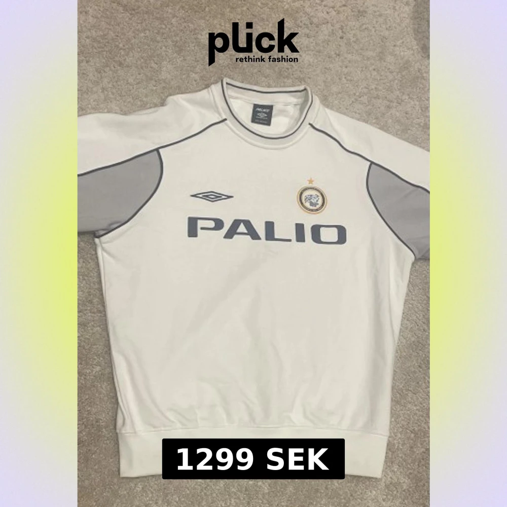 Vit och grå långärmad sweatshirt från Palace x Umbro med tryck på både fram- och baksida. Tröjan har mörkblå detaljer, logga och emblem på bröstet samt kontrastpaneler på ärmarna. Perfekt för dig som gillar streetwear och sportig stil. Tveka inte på att skriva vid frågor.