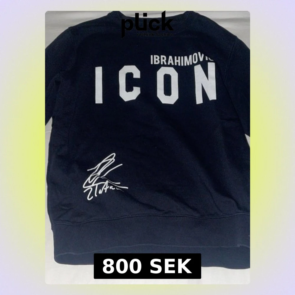Säljer en svart tröja från DSQUARED2 med stor vit 'ICON' text och 'IBRAHIMOVIC' på framsidan samt autograftryck. Baksidan har ett foto, DSQUARED2-logga och Zlatan-citat. Skön passform och cool design, perfekt för dig som gillar streetwear och fotboll.