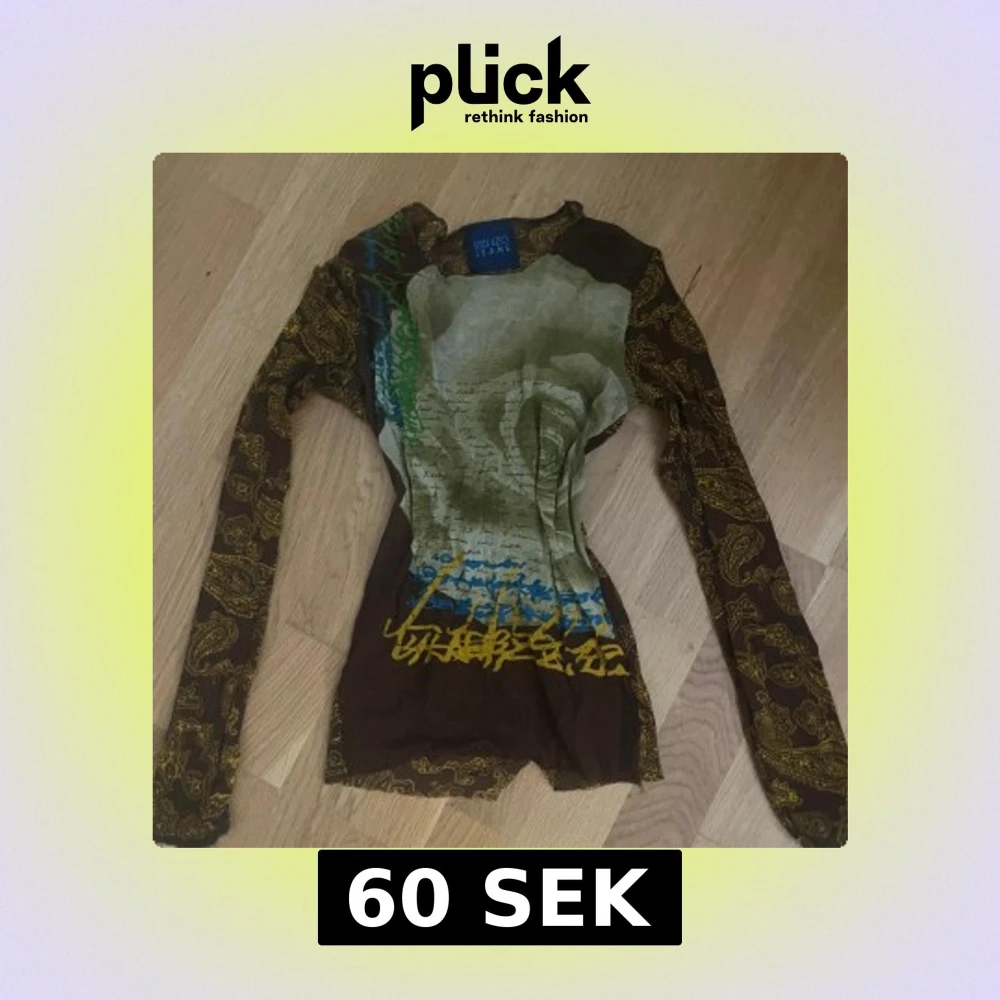 Säljer en unik långärmad topp från Kenzo Jeans i brunt med gult paisleymönster och coolt tryck framtill i grönt, blått och gult. Tunn och stretchig med figurnära passform, perfekt för dig som gillar statement-plagg och konstnärliga prints.