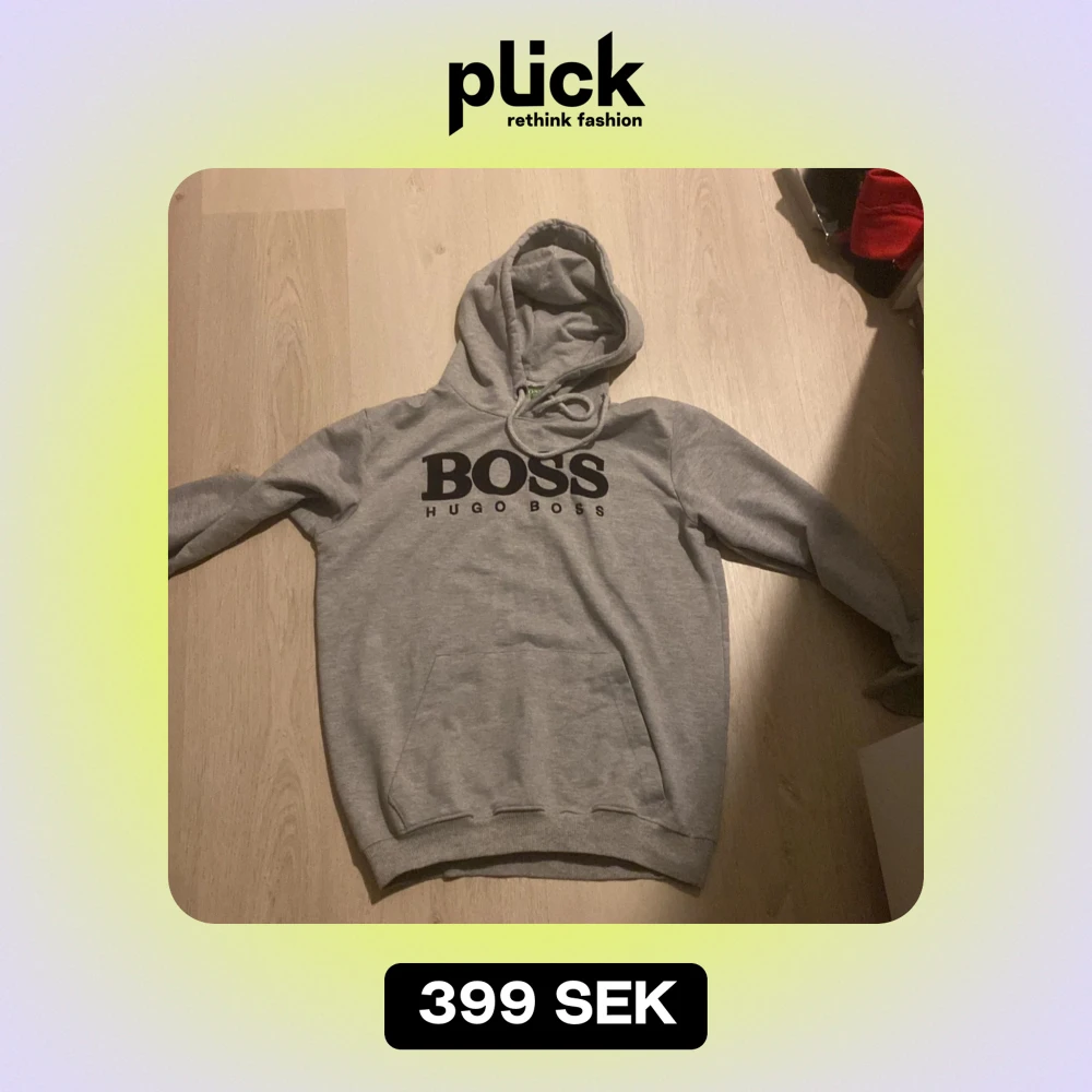 Säljer en snygg grå hoodie från Hugo Boss i mycket bra skick. Den har en stor BOSS-logga på bröstet och en praktisk magficka. Perfekt för både vardag och chill. Huvan har passform. Passar perfekt till höst och vår!