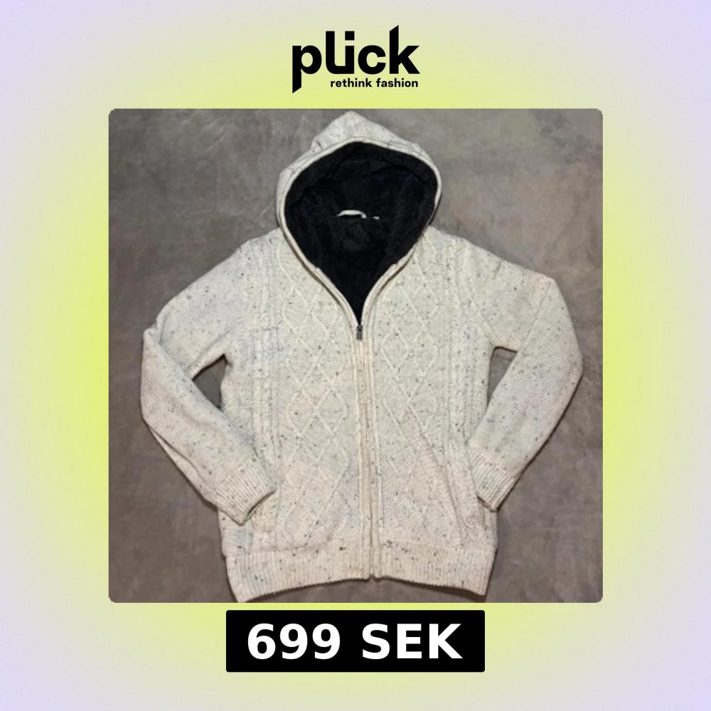 Mysig vit stickad hoodie med dragkedja och huva fodrad i svart fleece. Tröjan har ett klassiskt kabelstickat mönster framtill och ribbade muddar. Perfekt för kyliga dagar när du vill vara både varm och snygg.
