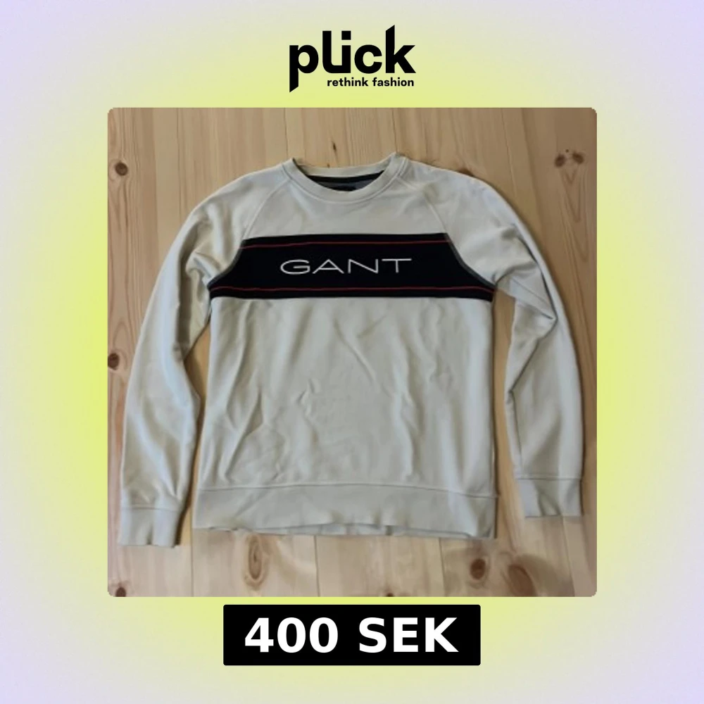 Snygg beige sweatshirt från GANT med svart panel och vit logga över bröstet, samt röda linjer som detalj. Tröjan har rund halsringning och långa ärmar. Perfekt för en chill och stilren look.