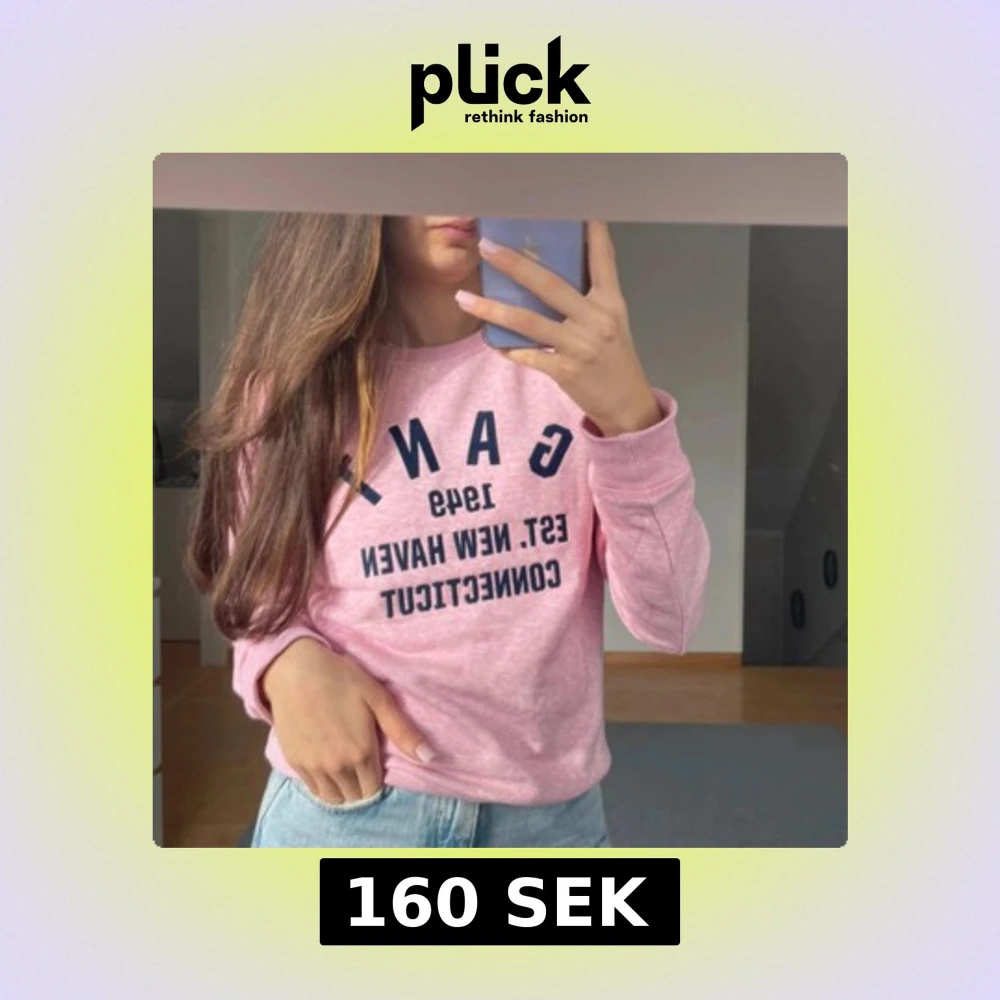 Säljer en rosa sweatshirt från GANT med tryck i marinblått på framsidan. Tröjan har långa ärmar och en rund halsringning. Knappt använd