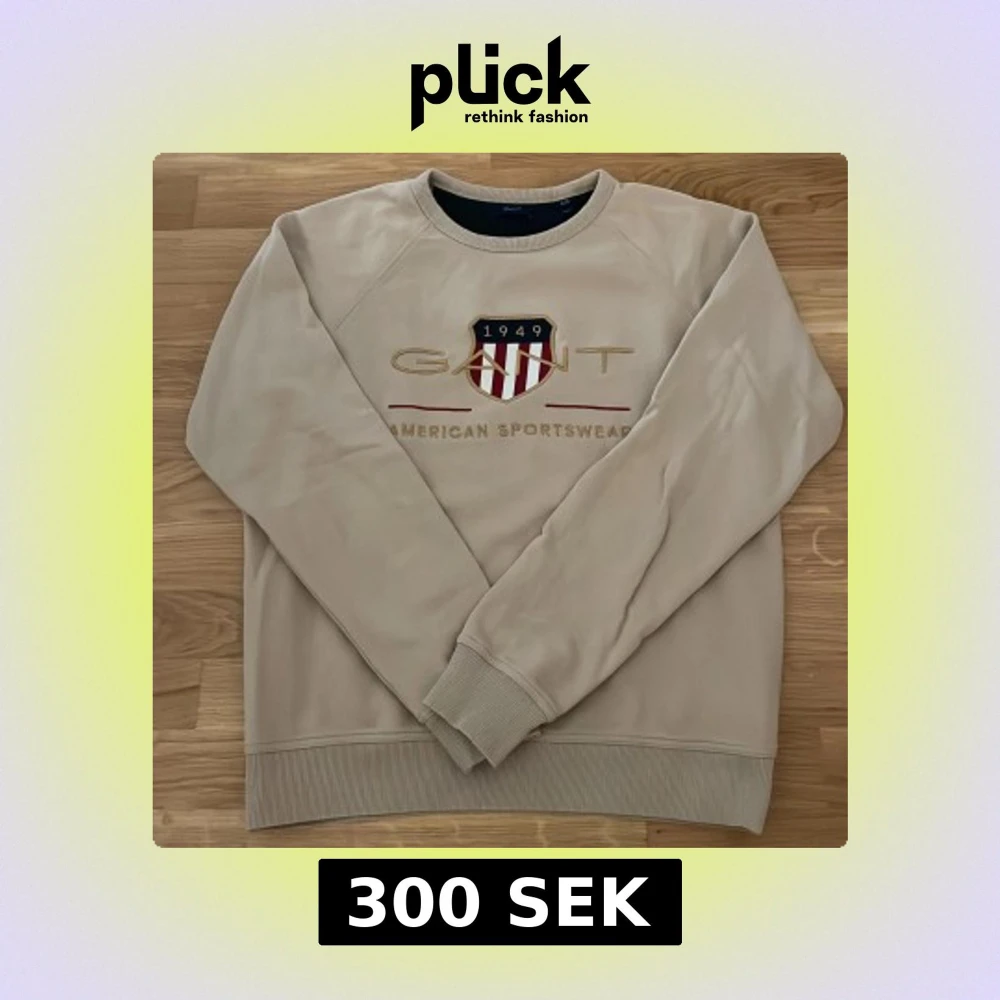 Säljer en stilren beige sweatshirt från GANT med broderad logotyp och text på framsidan. Tröjan har långa ärmar och ribbade muddar vid ärmslut och nederkant. Perfekt för en avslappnad stil.