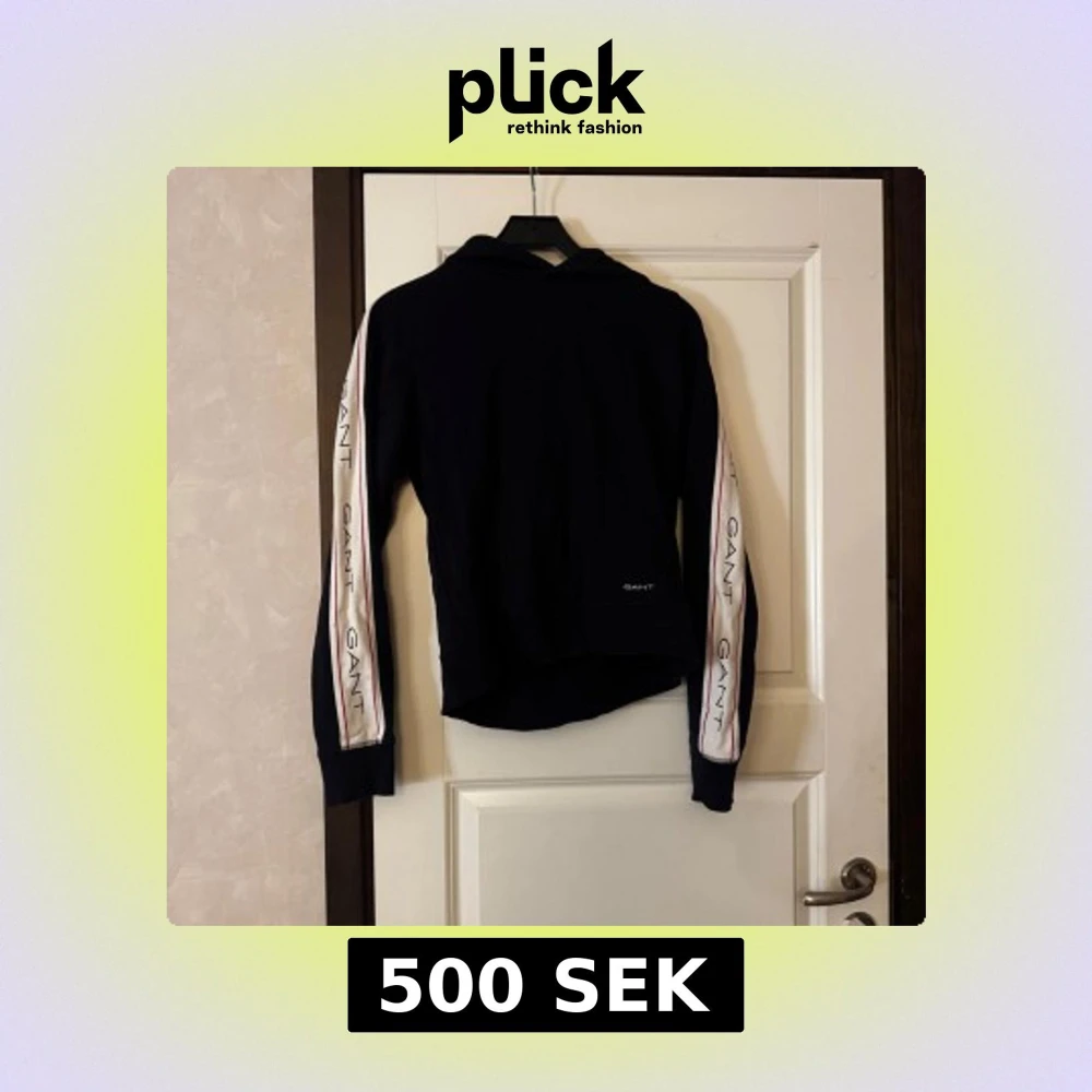 Säljer en mörkblå hoodie från GANT med vita och röda ränder längs ärmarna där GANT-loggan är tryckt flera gånger. Tröjan har huva och långa ärmar, perfekt för en avslappnad stil.