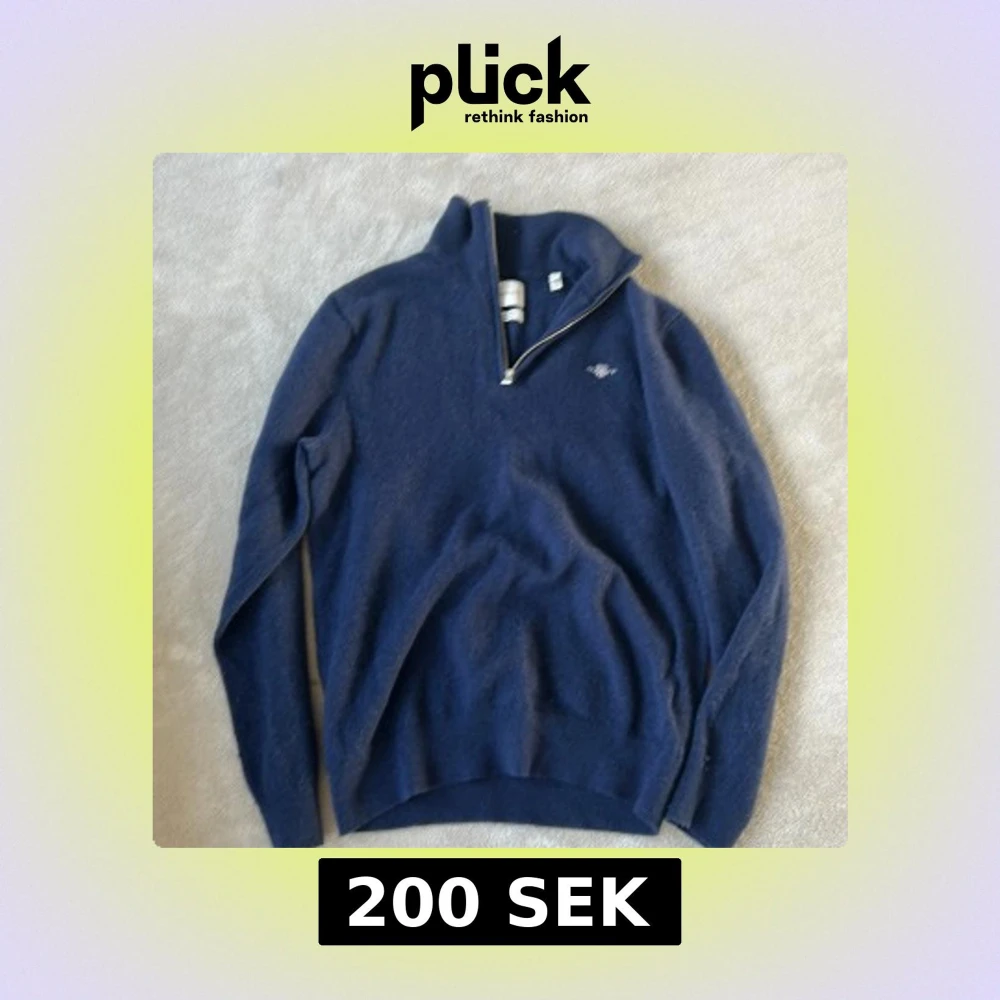 Säljer en stilren mörkblå tröja med halv dragkedja och hög krage. Tröjan har långa ärmar och en liten logga på bröstet. Perfekt för kyligare dagar.Den har krymp lite men är en Medium men upplevelse som Smal