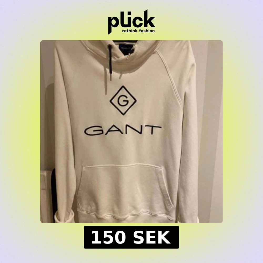 Säljer en stilren vit hoodie från GANT med svart logotyp på bröstet. Tröjan har en klassisk känguruficka och justerbar huva med snören. Perfekt för en avslappnad look.