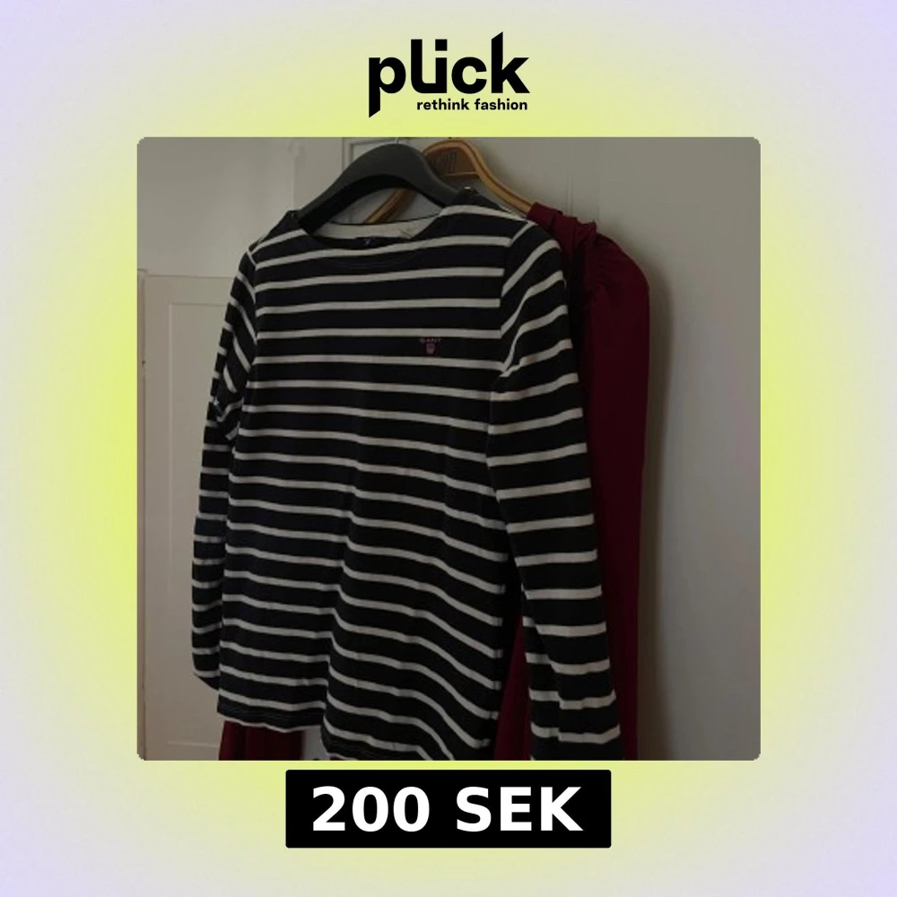 Snygg långärmad tröja från GANT i marinblått och vitt med klassiskt randigt mönster. Tröjan har rund halsringning och broderad GANT-logga i rosa på bröstet. Tillverkad i mjuk bomull, perfekt för en chill och stilren look. Storlek 170 men sitter som en storlek S