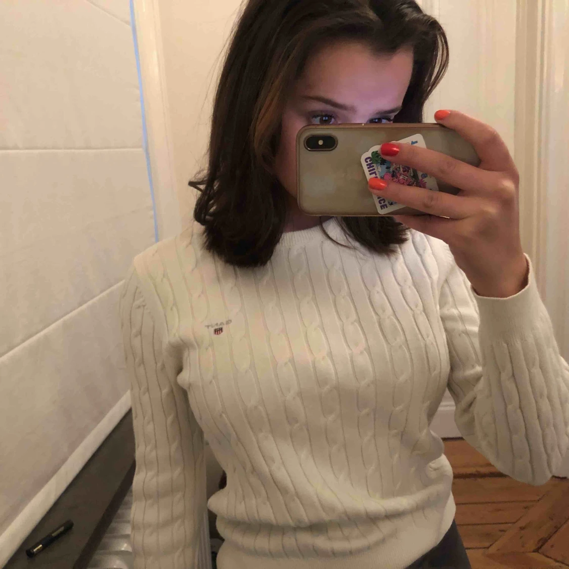 Passar xs/s. Jätte söt kabelstickad tröja från Gant. Inte använd många gånger och därför säljer jag. Bra skick🥰🥰🥰