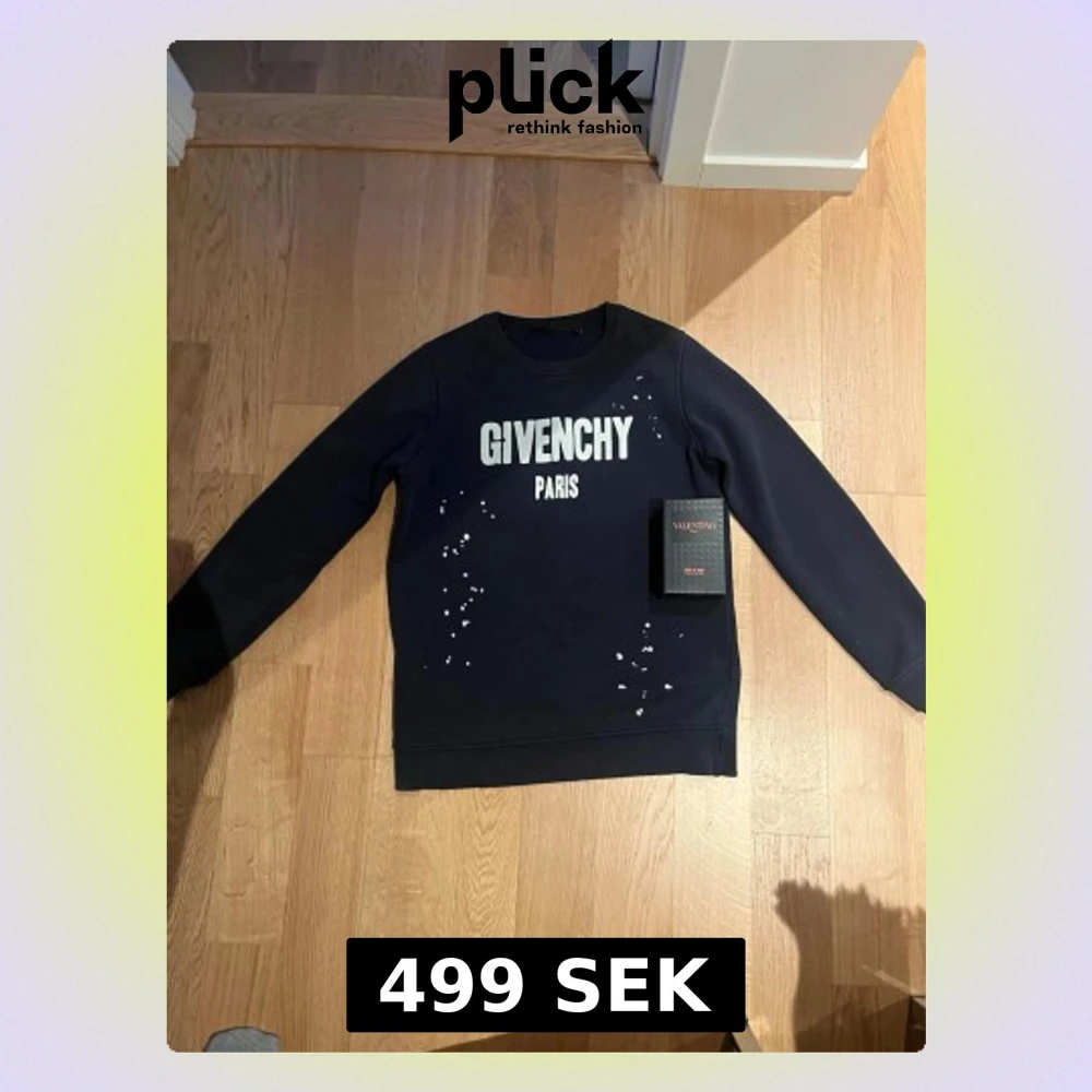Snygg svart sweatshirt från Givenchy med vit logga och texten 'PARIS' på bröstet. Tröjan har rund halsringning och vita stänkdetaljer på framsidan för en cool, trendig look. Perfekt för dig som gillar streetwear och exklusiva märken.
