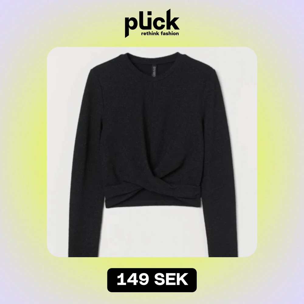 Kort svart topp i mjuk jersey med glitter. Rund halsringning , långa ärmar och omlott drapering i fållen. Tröjan är som en magtröja o slutar vid midjan/under bröstet. Helt oanvänt med prislapp på.