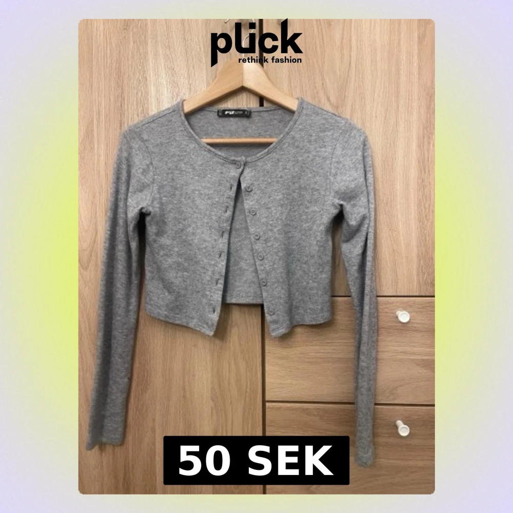 Snygg grå cropped kofta med rund halsringning och långa ärmar. Koftan har knäppning framtill med små knappar och är tillverkad i ett mjukt, stretchigt material. Perfekt att styla över ett linne eller t-shirt.