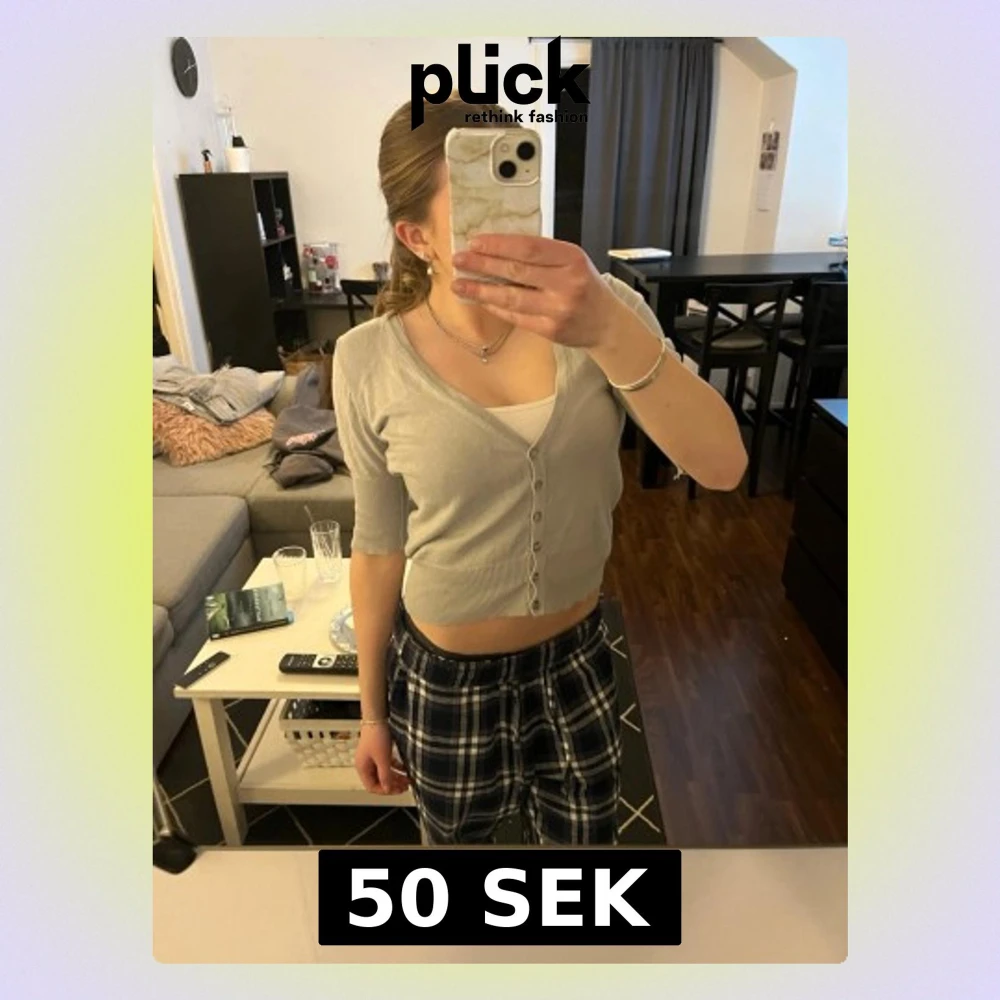 Snygg ljusgrå kofta från KappAhl med djup V-ringning och knappar framtill. Modellen är kort och har ribbade muddar vid ärmslut och nederkant. Perfekt att bära över ett linne eller t-shirt.