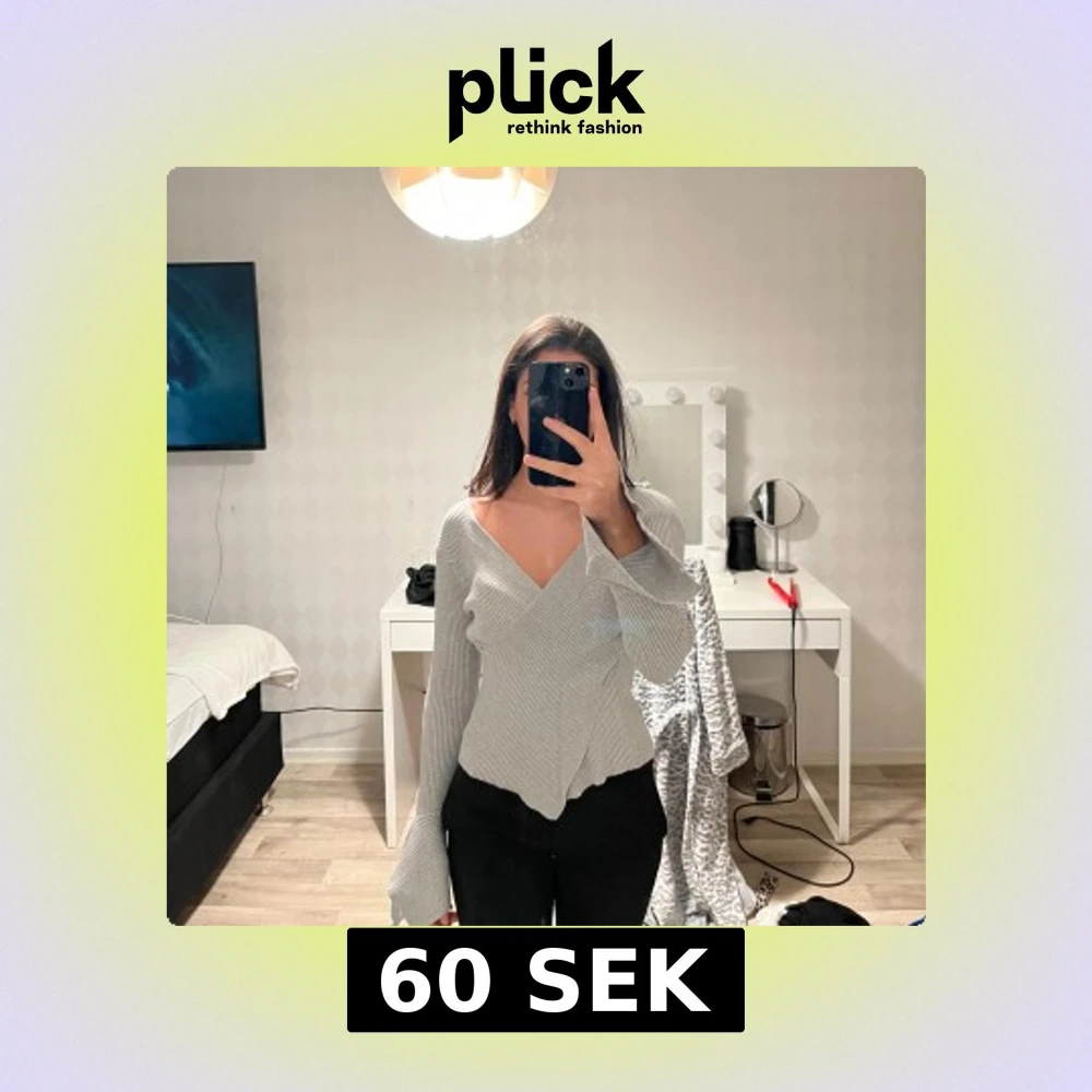 Säljer en stilren grå ribbad tröja. Tröjan har långa ärmar med en unik utsvängd design och en v-ringad hals. Perfekt för en trendig look.