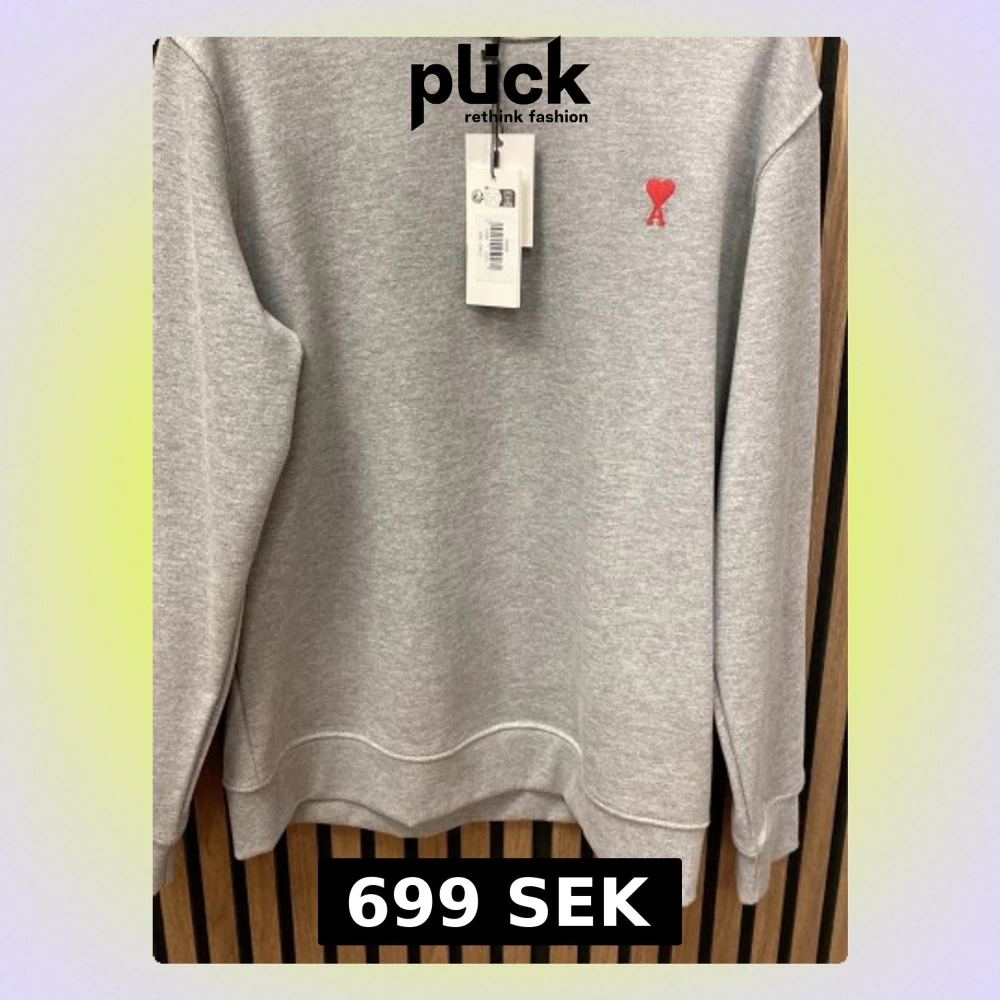 Säljer en stilren grå sweatshirt med röd broderad logga i form av ett hjärta och bokstaven A på bröstet. Tröjan har rund halsringning, ribbade muddar och är tillverkad i mjuk bomullsblandning.