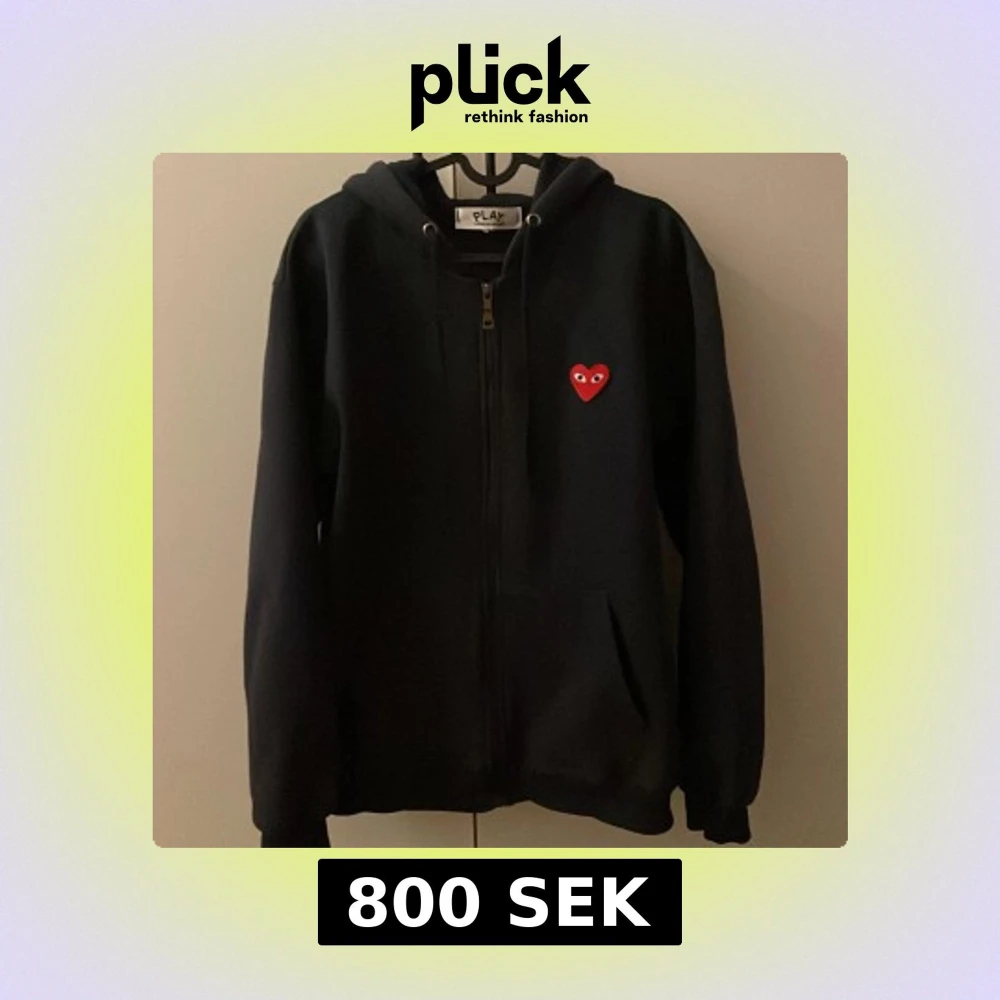 Navy hoodie med dragkedja och huva från Comme des Garçons Play. På bröstet sitter det ikoniska röda hjärta med ögon. Tröjan har ribbade muddar, fickor fram och är tillverkad i mjuk bomull. Perfekt för dig som gillar streetwear och vill ha något som sticker ut.