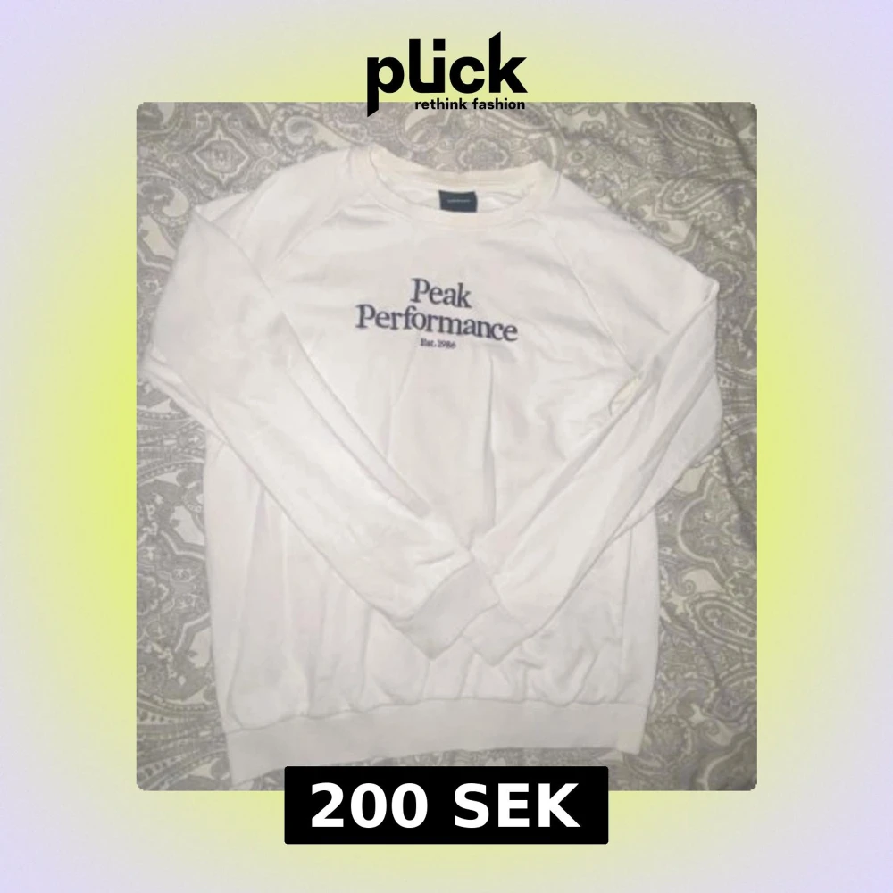 Säljer en vit sweatshirt från Peak Performance med svart logga ganska schyst inga märken osv jättechill bekväm tröja, Storlek 170