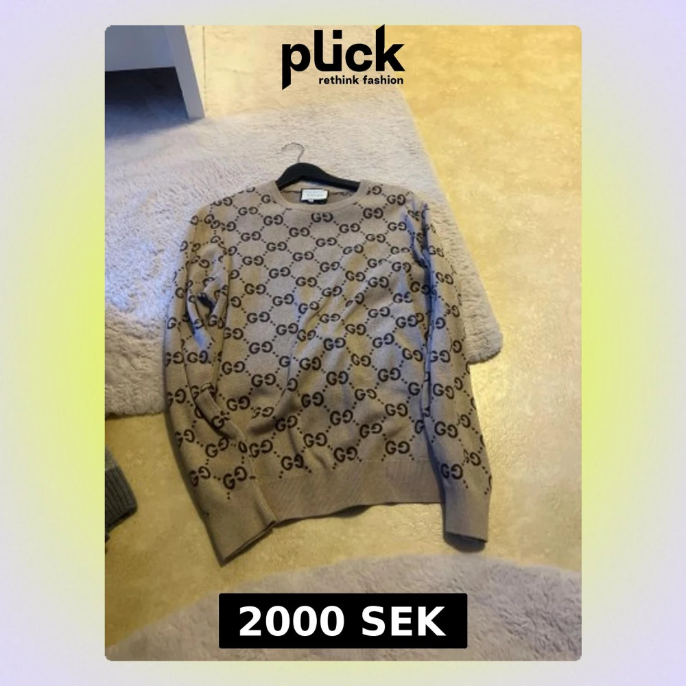Snygg beige tröja från Gucci med klassiskt GG-monogram över hela plagget. Rund halsringning och ribbade muddar vid ärmslut och nederkant. Perfekt för dig som gillar exklusiv streetstyle och vill sticka ut.