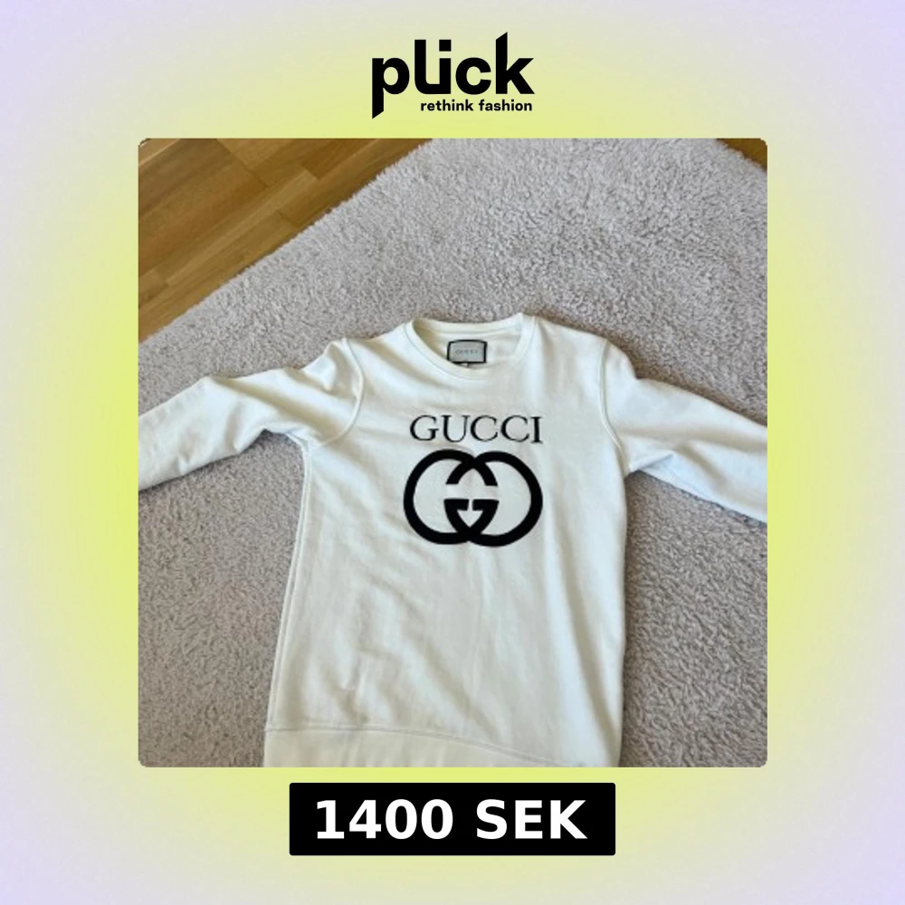 Säljer en stilren vit tröja från Gucci med det ikoniska logotyptrycket i svart på framsidan. Tröjan har långa ärmar och en klassisk rund halsringning. Perfekt för en avslappnad men lyxig look.