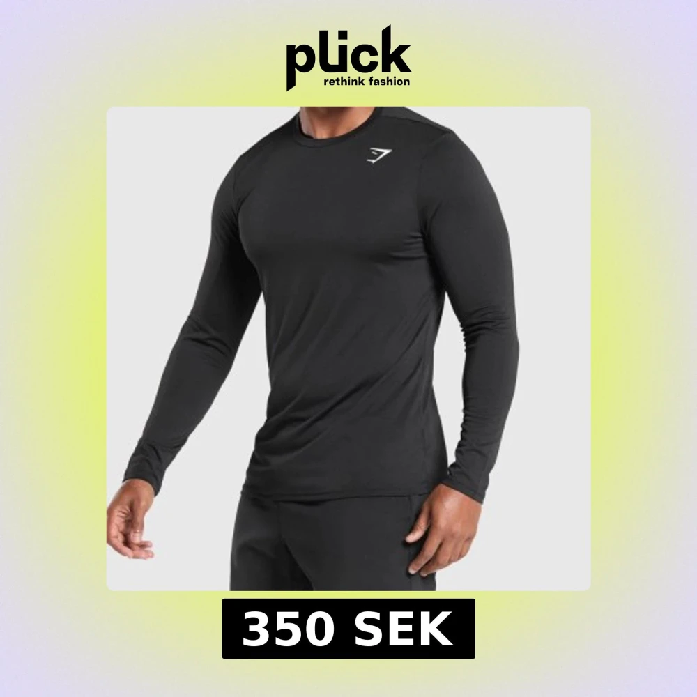 Säljer en svart långärmad träningströja från Gymshark med diskret logga på bröstet. Tröjan har en tight passform och är tillverkad i ett syntetmaterial som andas, perfekt för gym eller löpning.