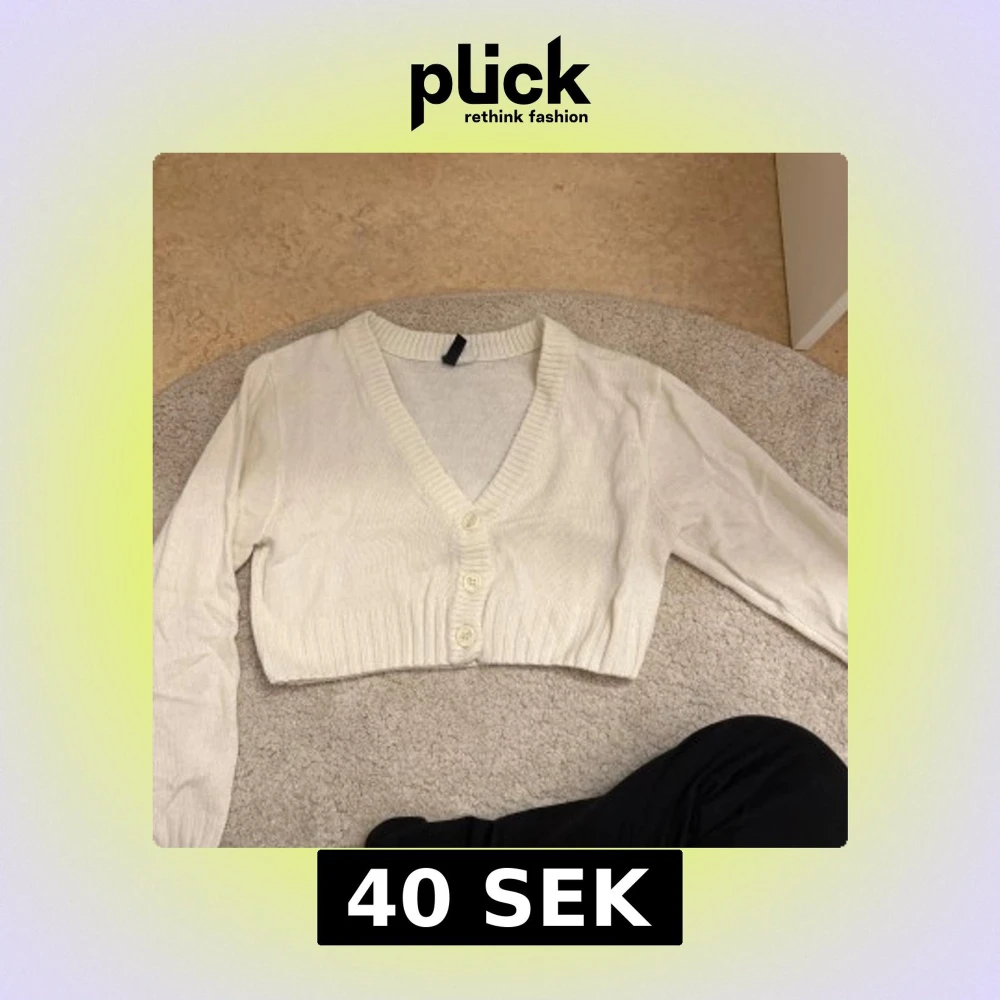 Säljer en vit kofta från Divided med v-ringning och knappar framtill. Den är croppad och har långa ärmar, perfekt för lager på lager-stil. Passar bra till både jeans och kjol. 🖤
