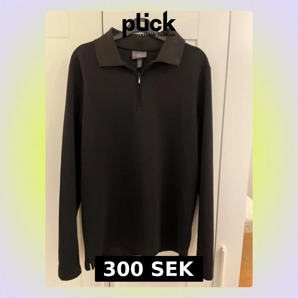 Svart pikétröja från H&M med lång ärm och klassisk krage. Tröjan har en half zip-dragkedja framtill och är tillverkad i ett mjukt syntetmaterial som känns skönt mot huden. Passformen är normal och funkar perfekt till jeans eller chinos.