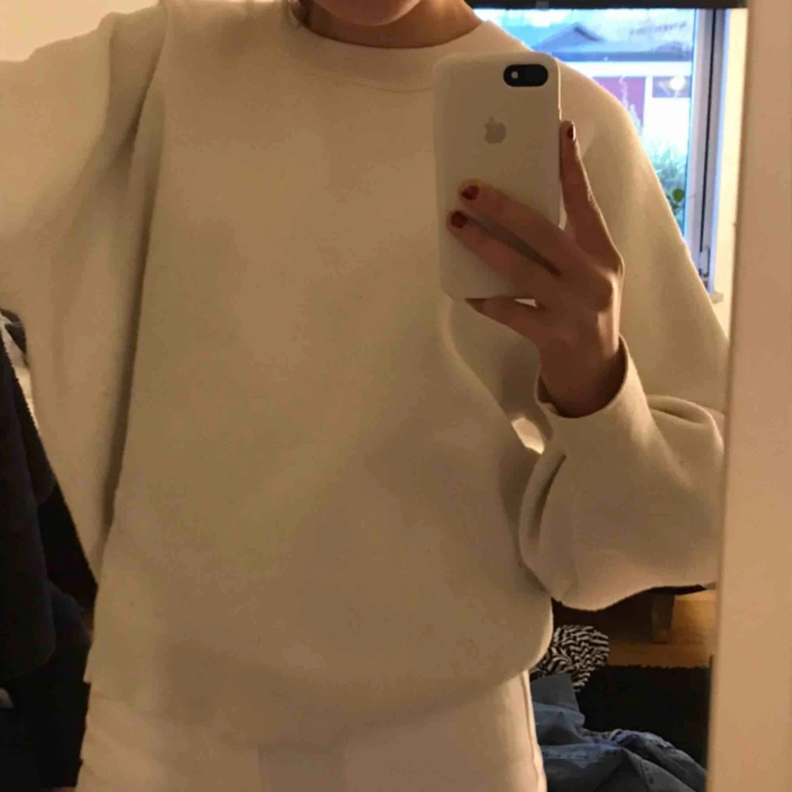 Storlek S men är lite lite lite större. En superhärlig tröja som är riktigt bekväm. Ribbad där nere. Lite nopprig nedantill men det är inget man tänker på. (Pris kan diskuteras)
