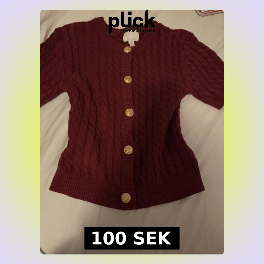 Vinröd kabelstickad kofta från h&m med korta ärmar och snygga guldknappar framtill. Koftan har rund halsringning och ribbade muddar vid ärmslut och nederkant.