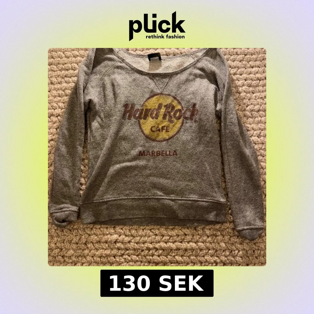 Grå långärmad tröja från Hard Rock Cafe Marbella med klassiskt tryck i gult och rött framtill. Står ingen storlek men skulle gissa S/M