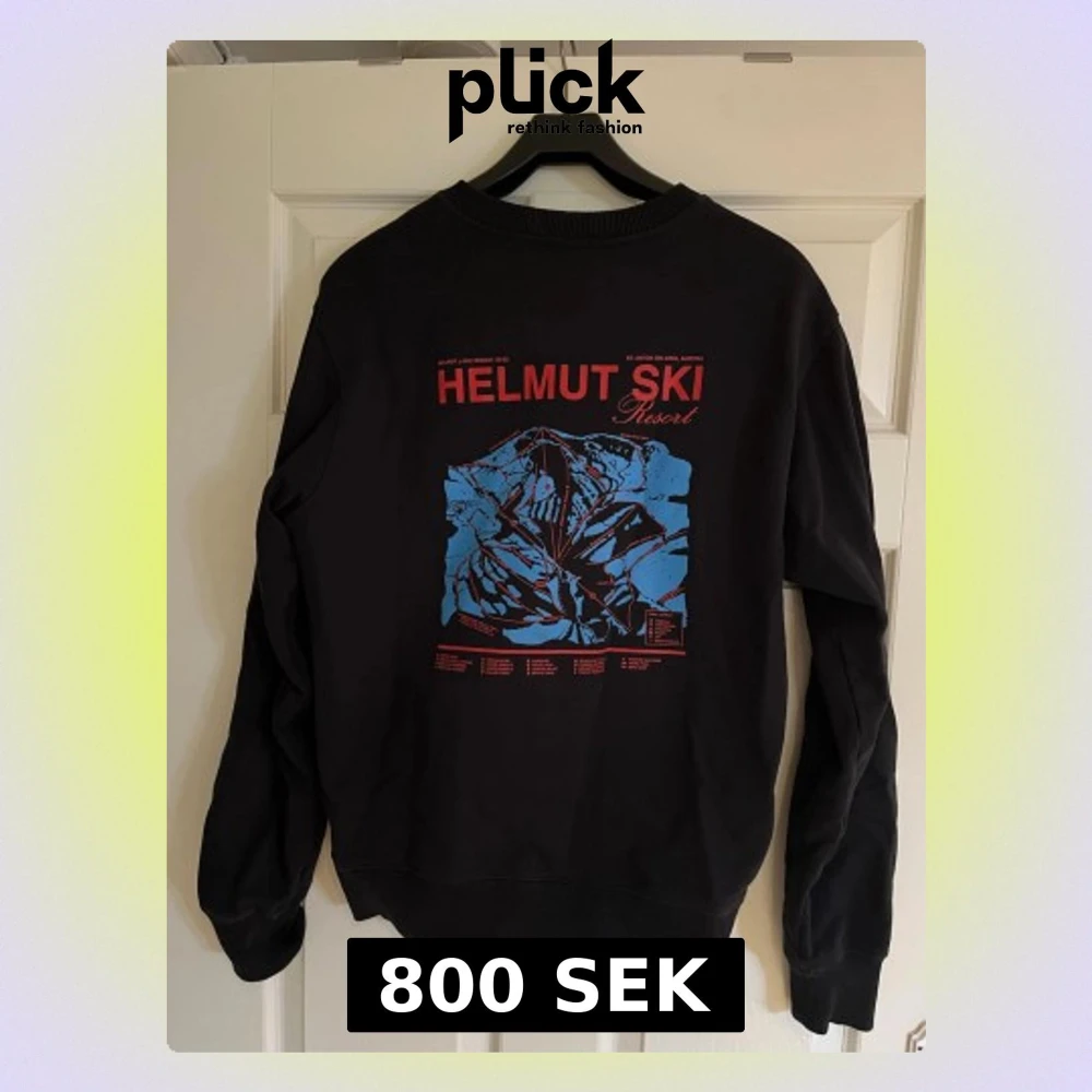Cool svart sweatshirt från Helmut Lang med tryck i rött och blått. Framsidan har en liten logga på bröstet och baksidan har ett stort grafiskt tryck med bergsmotiv och text. Rund halsringning och ribbade muddar. Perfekt för dig som gillar streetwear och grafiska prints.