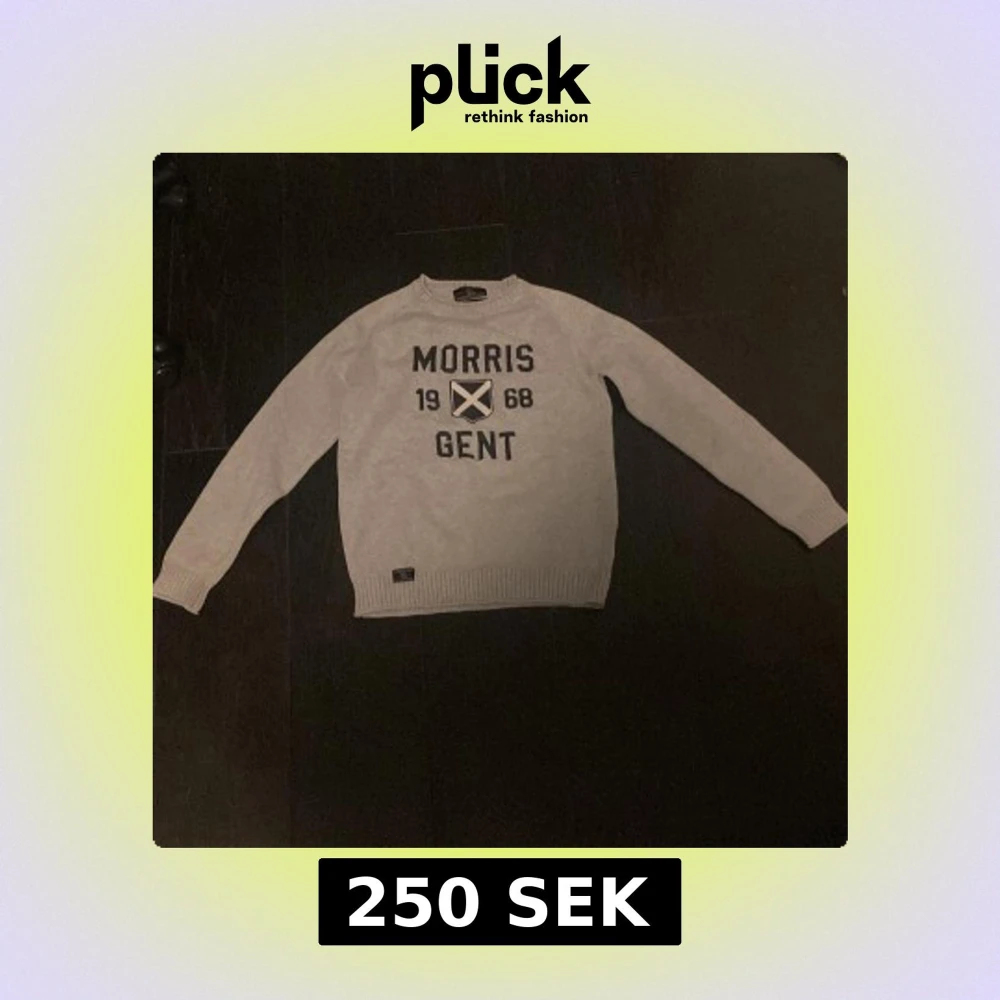 Säljer en ljusgrå tröja från Morris Gents med svart tryck framtill där det står 'Morris Gent 1968' och ett emblem. Tröjan har rund halsringning och långa ärmar, samt ribbade muddar vid ärmslut och nederkant.