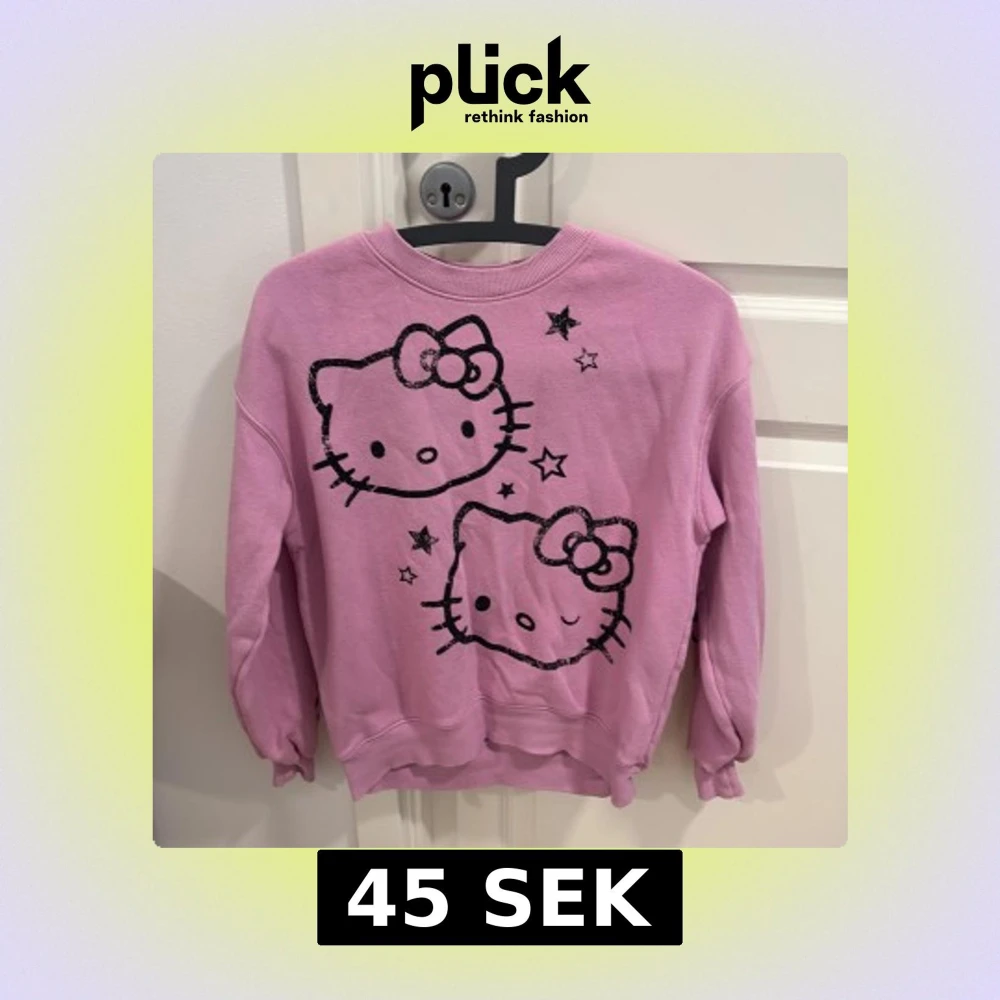 Säljer en söt rosa sweatshirt med Hello Kitty-tryck och stjärnor på framsidan. Tröjan har långa ärmar med texten 'HELLO KITTY' längs ena ärmen och stjärnor på den andra. Perfekt för alla Hello Kitty-fans!