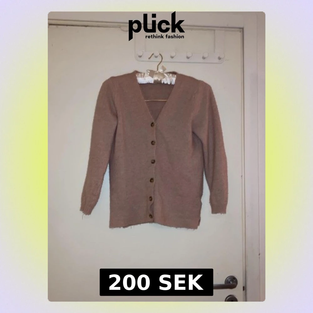 Mysig beige kofta med v-ringning och bruna knappar framtill. Långärmad och rak modell, perfekt att slänga över en t-shirt eller topp. Koftan är stickad i ett mjukt material och har ribbade muddar vid ärmslut och nederkant.