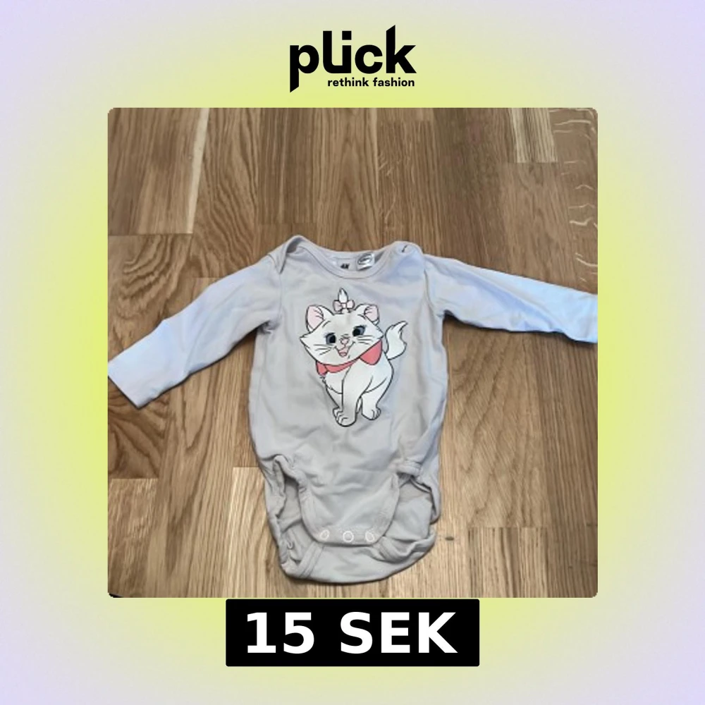 Söt vit långärmad body från H&M med ett gulligt kattmotiv från Disney. Tillverkad i ekologisk bomull, perfekt för de minsta. Praktiska knappar i grenen för enkel på- och avklädning.